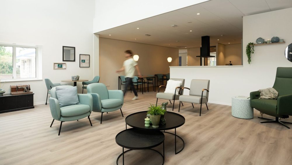 De ruime woonkamers zijn ingericht met gezellige zithoeken die uitnodigen tot sociaal contact. Tegelijkertijd is er voldoende gelegenheid voor bewoners om zich even terug te trekken als ze behoefte hebben aan privacy. Deze balans zorgt ervoor dat de woonruimtes levendig en comfortabel aanvoelen, en dat bewoners zich op hun gemak voelen in hun omgeving. Naast visuele elementen speelt ook geur een belangrijke rol in het welzijn van de bewoners. Door het toevoegen van geurbeleving, met geuren die vertrouwd en herkenbaar zijn voor de bewoners, wordt een veilige en aangename sfeer gecreëerd. Dit kan helpen om onrust en angst te verminderen, wat zorgt voor een algeheel gevoel van welzijn.