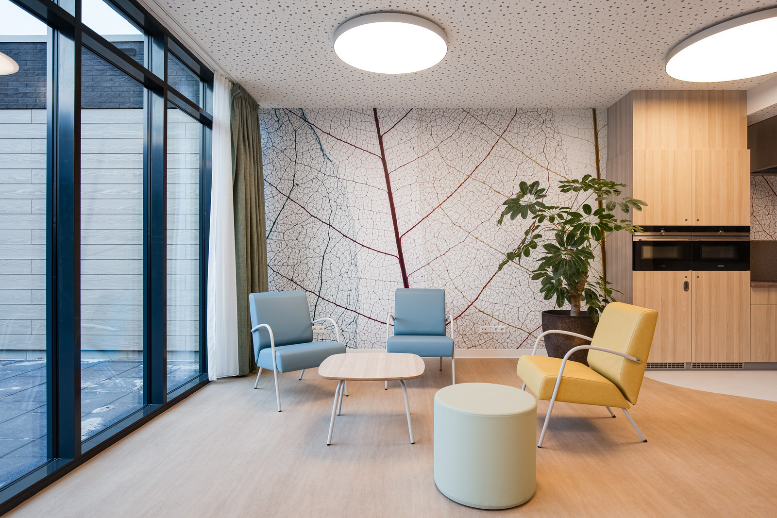“Kleur is van invloed op onze emoties, daarom is er gekozen voor lichte tinten die rustgevend werken. We hebben verschillende ruimten ingericht, zoals de woonkamers, de vijf minutenkamer, de extra beveiligde kamer (EBK), recreatie- en familie kamers, de comfort room en zit- en slaapkamers. We zijn echt super trots op het eindresultaat!”