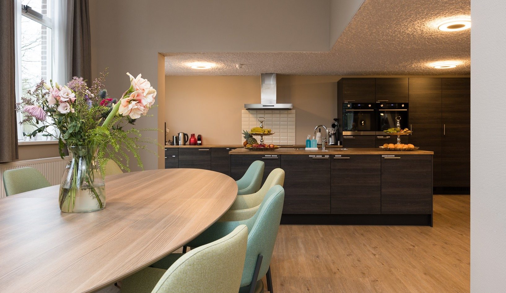 Het is een huis waar een warme, persoonlijke en uitnodigende sfeer centraal staat. Binnen deze visie heeft Exsta de gezamenlijke huiskamer en gang ingericht. Verbinding is één van de kernwaarden: de organisatie wil een eenheid vormen met de bewoners, hun naasten en de buurt.